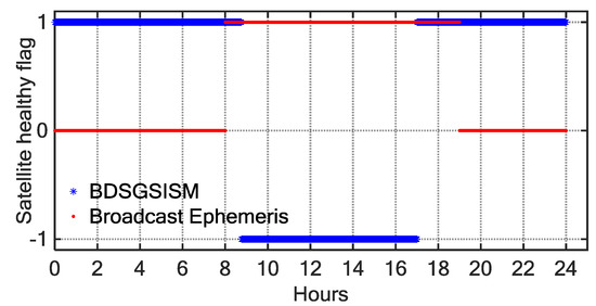 Satellite-health flag as a function of BDT, determined using two methods (blue *, BDSGSISM; red dots, broadcast ephemeris) on day 359 of 2015 for BDS satellite C10.
