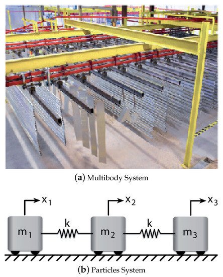 Figure 1 depicts two systems composed of several bodies. The first system consisting of three moving bodies, the trolley plus a payload formed by two rigid links, might constitute a multibody model of an overhead crane. The bodies of this system interact with each other through translational-plus-revolute joints. The kinematic constraint equations corresponding to the joints set up a dependence between the bodies coordinates, so the overhead crane mechanism can be referred to as a three Degree Of Freedom multibody system. The second system is also a (3-DOF), but the bodies do not reach each other through joints but forces. In other words, the spring-mass system can not be considered strictly as a multibody system, and it is customary to model this system considering the masses as particles Figure 1b. Both systems exhibit an underdamped response, so mechanical vibration occurs when moving without taking into account such flexibility. The corresponding oscillatory responses can be determined using a particle oriented model regarding the three masses and springs system or a well suited multibody model for the overhead crane case.
