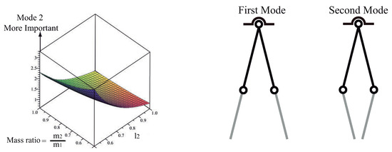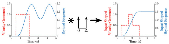The overhead cranes referred to above feed components to warehouses and manufacturing cells in industry. Such operations usually involve moving distributed, multibody payloads. Mitigating the transient sway helps avoid the collisions between such payloads and surroundings. Cancelling the residual vibration at the end of the motion facilitates the operations of loading and unloading. Obviously, overcoming such vibration benefits the performance. Overhead cranes are only a small group of the wide array of crane systems. Subsequently, it is not surprising that a quite valuable amount of research and development has faced the flexibility problem, thinking about improving human operation and performances of crane systems that exhibit oscillatory dynamics. Attenuating vibration induced during the maneuvering of oscillatory mechanical systems by designing the command reference signal profile is one of the most appealing solutions adopted [4,5,6]. The generalized term formally accepted for this strategy is command shaping. The method requires only estimates of the natural frequencies and damping ratio parameters. The apparent simplicity regarding the identification of these parameters, dealing with linear systems whose dynamics is described by ordinary differential equations (ODEs), allows it to be used in a straightforward manner as shown in Figure 2. In this figure a step input is convolved with a two impulse sequence, and resulting convolution sum causes no system vibration. In fact, the two mass and spring particle oriented model has become the command shaping benchmark system. The intuitive Newtonian laws application is the more customary option to obtain the ordinary differential equations describing the dynamics for such type of linear systems in the command shaping research [7,8,9,10,11,12,13,14].