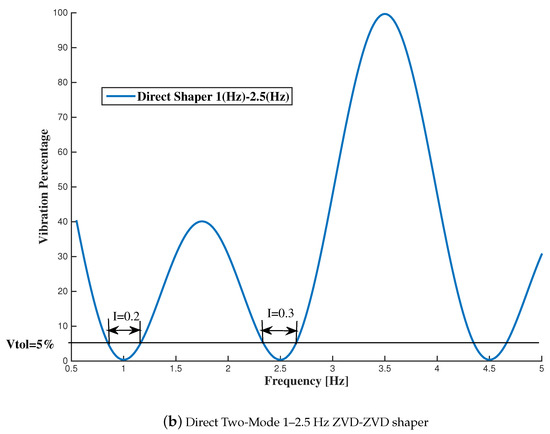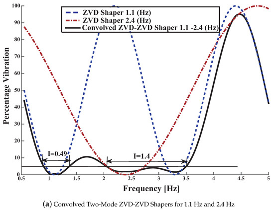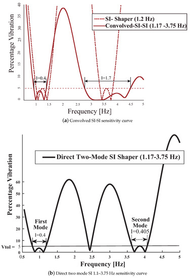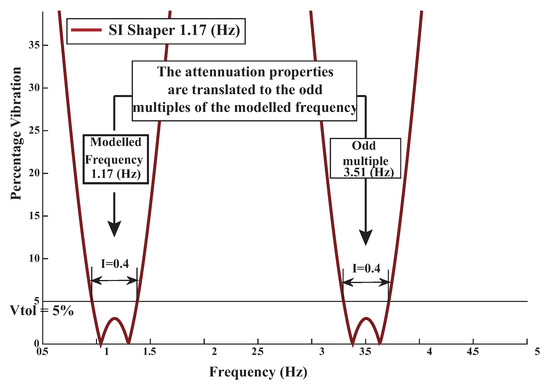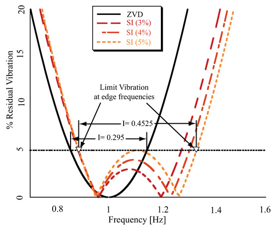 In the Input Shaping research [16,19,20], this important equation can be found repeatedly. By using Equation (1) as a constraint equation, it is possible to set the residual vibration to a desired percentage of the pre-existing vibration, that is, the vibration that occurs without filtering with Input Shaping. As demonstrated in Figure 3, increased and selective robustness can be achieving if a Specified Insensitive (SI) shaper is designed to mitigate vibration at specified frequency ranges. The most straightforward method for generating a shaper with specified insensitivity to frequency uncertainty is the technique of frequency sampling [19]. This method implies repeated use of the also called residual energy Equation (1) at each one of a frequencies set, spaced at a regular sampling period, contained in the given frequency band. In each case, is set less or equal to the tolerable level of residual energy. If the limit is relaxed, allowing some increase, then the robustness of the Shaper/Filter also increases, keeping unchanged the set of frequencies where such constrain is applied as demonstrates Figure 3.