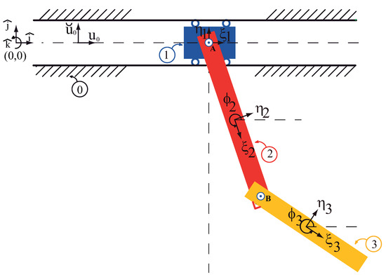 The three moving bodies and ground, without considering the existence of the joints, form an unconstrained system shown in Figure 5. The x- and y-coordinates of the origin of each frame describe the translational coordinates of that body. The angle between each -axis and the x-axis describes the rotational coordinate of that body, . Obviously, the presence of the kinematic joints, these variables no longer remain independent from one another, i.e., they are dependent coordinates.
