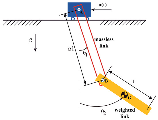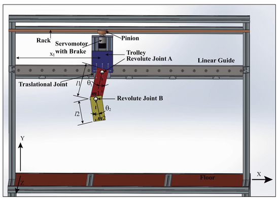 To give a more detailed description of the overhead crane with the double-pendulum multibody payload during motion, the position of the link-1 and link-2 within the Newtonian frame are written in the independent coordinates judiciously: , and respectively as shows Figure 6 corresponding to the functional mock-up interface (FMI). The trolley moves lengthwise the linear guide, its position is described by . As stated above the payload is composed by two rigid links plus two revolute joints. The link-1 of length hangs from the trolley via the revolute joint A, the second link-2 is connected to the link-1 via the revolute joint B. Both links are represented as rigid bodies having masses , plus the corresponding inertial properties and . The angles describing the deviations from vertical are shown in Figure 6. Notice that the angles and are defined by a vertical line in the Y-axis direction from the trolley to the floor.