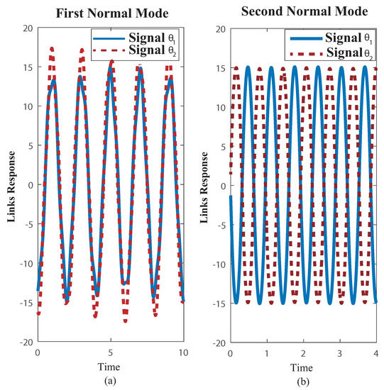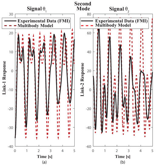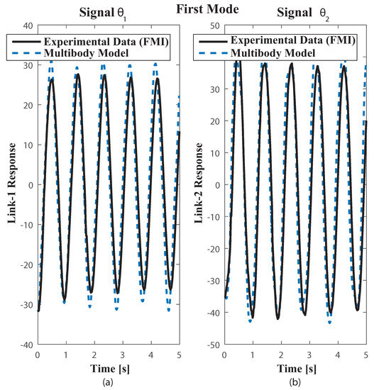 The multibody model was tested on the functional mock up interface (FMI) with the two link payload suspended from the trolley, using both measuring FMI real world system through a comparison of results obtained from the multibody model simulation as in [34]. The payload free vibration data was collected by video tapping the trajectory and measuring position of the mass centres plus revolute joints at each frame. The selected video recording speed was 60 fps. The payload response to initial conditions well suited to excite the first and second modes of vibration can be seen in the corresponding Figure 7 plus Figure 8. Dealing with the first mode both links oscillate closely to 30 about the equilibrium position at a frequency of 1.1 Hz Figure 7. The second mode which is at 2.4 Hz shown in Figure 8 despite the actual experimental underdamped response when compared with the undamped multibody model response both behave closely. Nonetheless, as the number of vibration cycles increases the damping at joint B becomes relevant. This might cause some frequency mismatch, recall that , especially as the number of cycles increases.