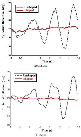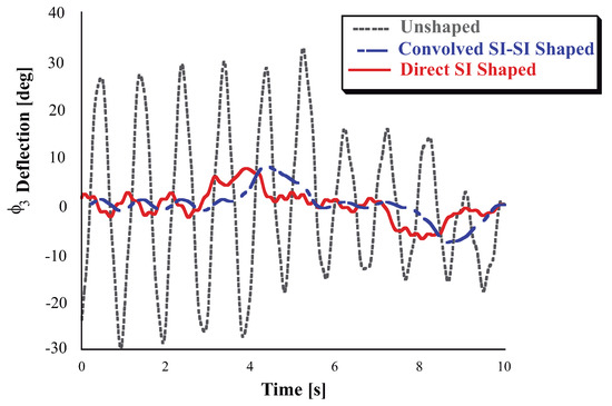 The Experimental results shown here will be presented by modulating the baseline trapezoidal velocity profile command signal of the trolley, which has the following parameters: unshaped slope = 0.8 m/s, final velocity , rise time 1.25 s. The Convolved SI-SI shaper duration is 1.2460 s. The overall Figure 23 shows the responses when the trolley of the FMI undergoes the unshaped baseline velocity profile the Direct and the Convolved SI-SI Shaped velocity profiles. The second-link deflection has been chosen as the most descriptive variable to examine the video tapping responses. These responses are labeled with Unshaped, Direct Shaped and Convolved SI-SI Shaped marked with discontinuous line for the first case, continuous line for the second case and a hypen-line for the third case. Significant vibration exists for the unshaped response, the (generalzed coordinates) or (generalized coordinates) angle have a wide variation. For the Direct-shaped case the keeps close to its rest position. Please note that for the Convolved SI-SI case, the response is delayed in time regarding the Direct SI shaper. Nonetheless, as expected for the same range of kinematic parameters the shaped residual vibration always remains small. If the shaped vibration amplitude is divided by the unshaped vibration, then the resulting percentage of vibration is less than the 5%.