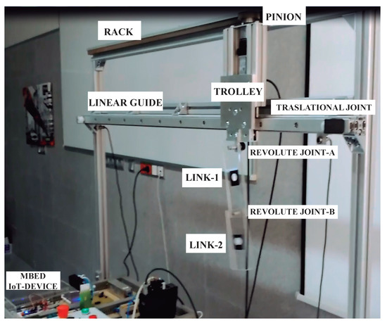 The experiments were conducted on the mini-overhead crane FMI called MUTOC (Multibody Two Link payload Overhead Crane). MUTOC consists of a rack fixed to the frame of reference, a linear bearing guide 1.5 m long whose trolley is actuated by an Accurax G5 Omron servomotor that is fastened firmly to the trolley by a bracket plus a miniature T-slot structure licensed by Markerbeam. To the servomotor shaft a gear was fixed using a parallel key.
