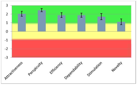 More complex aspects of the user experience can be measured by various standardized questionnaire based methods. One of the more commonly used methods is the User Experience Questionnaire (UEQ), which is analyzed in detail in Laugwitz []. It consists of 26 items, measuring six factors of user experience: Attractiveness, Perspicuity, Efficiency, Dependability, Stimulation, and Novelty. The questionnaire is language dependent; however, the studies conducted for the original German questionnaire and an English version indicate a satisfactory level of reliability and construct validity.