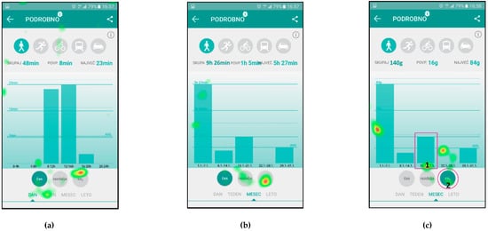 Figure 5 presents the scenario where the users were asked to check the amount of CO2 reduction due to their walking activities, in the third week of January on three consecutive screens. Not only was the eye-tracking device able to detect the most important parts of the user interface, but it could also distinguish between the selectors for time (Slovenian: Čas), distance (Slovenian: Razdalja), CO2 and time line in the bottom of the user interface. It also seems that the users were checking whether the walking activity was selected as there are some attention indicators on the top of the screen around the activity icons (Figure 5a).