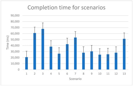 Figure 11 presents the average time (ms) it took users to successfully complete the individual scenario, including the standard deviation. Scenarios n. 2 and n. 3 took users the most time to complete. In these scenarios, the users had to identify and name the application features that they recognized on the application’s user interface, once using the built-in help feature and the second time without it. Scenario n. 4 asked of users to find the aggregated data for the current day including the distance covered, activity duration and CO2 savings. Scenarios n. 6 and n. 7 required of users to check the amount of CO2 reduction and walking time in the third week of January. In the last scenario, Scenario n. 13, the users had to find their position on the leader board.