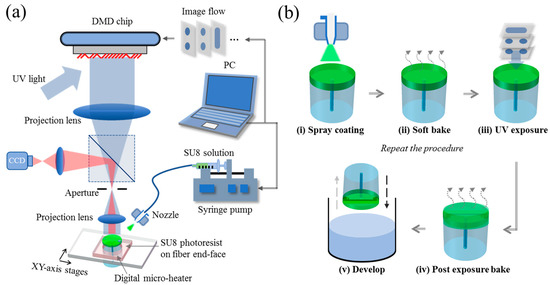 An in-house optical exposure setup, as shown in Figure 2a, was used to fabricate the optical fiber-tip sensors. The setup consists of a high-power UV source (365 nm), a UV-grade digital mirror device (DMD) for generation of optical patterns, projection optics for scaling down optical images, and a digital camera for machine vision metrology [28,29,30]. As it is a vitally important step to deposit uniform thin layers of SU-8, an ultrasonic nozzle was utilized to integrate the spray coating process with the optical maskless exposure technology to establish an optical 3D μ-printing technology. An xy-axis motorized stage was used to precisely align the optical fiber to right positions for UV exposure and SU-8 film deposition, respectively. The thickness of the single-layer SU-8 film can be tailored by adjusting the pumping rate of the syringe pump and the scanning velocity as well as the gas pressure associated with ultrasonic nozzle and the distance between the nozzle and substrate. In order to evaporate the solution after spray coating, ceramic heaters and thermal-couple were embedded in the mount of optical fiber to form a miniature integrated digital microheater.