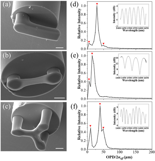 A broadband light source, a circulator, and an optical spectrum analyzer (OSA) were used to measure the reflection spectra of the fabricated optical fiber-tip FP micro-interferometers, as shown in Figure 4. Fast Fourier transform (FFT) of the measured optical spectra was calculated to analyze the cavity information of FP micro-interferometers. Reflection spectra and their FFT results of the optical fiber-tip FP micro-interferometers are shown in Figure 3d–f, respectively. It can be seen that the positions of their highest peaks in FFT results are well accordance with the length of the air cavities shown in the SEM images. For the FP cavities with thick suspended-beams, as shown in Figure 3d,f, there are three peaks in the FFT results, which are consistent with previous SU-8 FP cavities fabricated on fiber-optic ferrules [26]. For the FP cavity with thin suspended diaphragm, as shown in Figure 3e, however, the peaks tend to merge into one peak, which avails to depress the fluctuation of inference fringe in reflection spectrum. The cavity lengths deduced from the main peaks of the FFT results are 29.3, 14.7, and 39.1 μm, respectively, which agree well with the counterparts measured by SEM images.