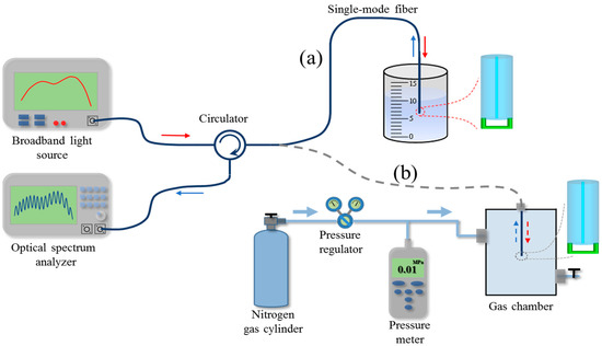 Schematic of the experimental setup for testing the optical fiber-tip sensors. (a) Refractive index sensing; (b) gas-pressure sensing.