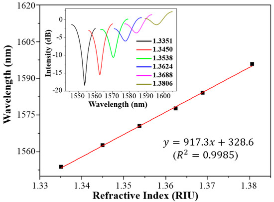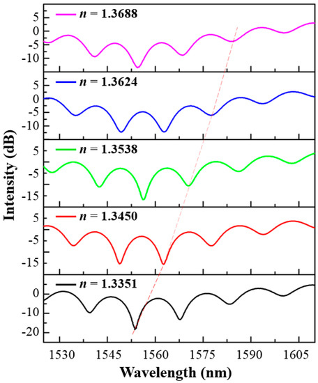where n is the refractive index of the medium in cavity, L is the cavity length, and k is the order of the spectral dip. Therefore, the tracked spectral dip will shift to longer wavelength when the refractive index of measurand liquid increases. For a small change of refractive index Δn, the shift of a specific spectral dip is