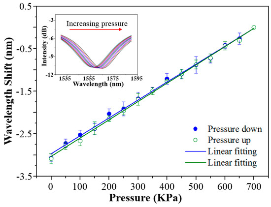 The response of the optical fiber-tip sensor to the change of gas pressure was measured by using a gas chamber, whose gas pressure was controlled by a high-pressure nitrogen cylinder with gas flow regulator, as shown in Figure 4b. The gas pressure can be tuned from 0 to 700 KPa with a step of 50 KPa. A commercial pressure meter was used as to monitor the gas pressure in the chamber. Figure 7 shows the measured response of the optical fiber-tip pressure sensor to the change of gas pressure. With the increase of chamber pressure, a red shift of the spectral dip was observed because of the increase of refractive index of nitrogen gas. The optical fiber-tip sensor showed good linearity and reversibility with both increase and decrease of the gas pressure. According to the linear regression, the sensitivity of the optical fiber-tip sensor to the gas-pressure change is 4.29 nm/MPa, which is close to the theoretical value of 4.17 nm/MPa predicted by Equation (4). With the calculated noise level (i.e., 0.031 nm), the detection limit of the optical fiber-tip gas-pressure sensor is estimated to be about 22.2 KPa at a signal–noise ratio of 3 [36]. Compared with other diaphragm-based optical fiber-tip pressure sensors, this open-cavity optical sensor has relatively low sensitivity, but a wide measurement range, and thus is suitable for high air-pressure measurement applications.