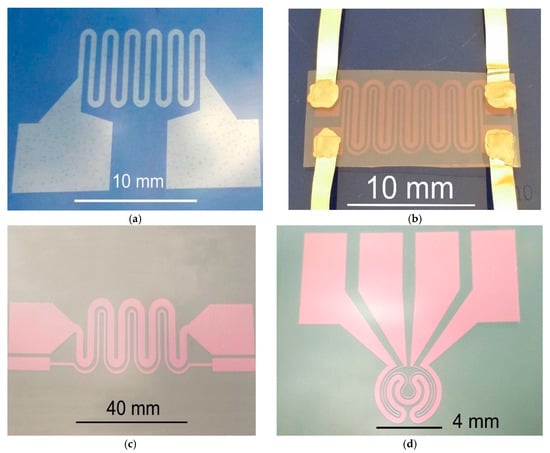 Samples of structures made by direct laser patterning in indium tin oxide (ITO) and ITO/Ag/ITO layers: (a) meander shaped resistor (ITO layer on PET); (b) resistor with thermosensor (ITO/Ag/ITO layer on PET); (c) resistor with thermosensor—“long” (ITO/Ag/ITO layer on PET); (d) microheater with sensor (ITO/Ag/ITO layer on PET).