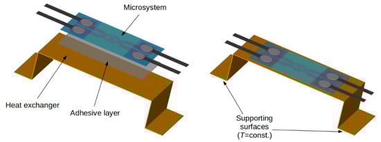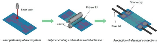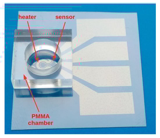 The electrical connections to the contact pads of the heater and sensor (Figure 1b–d) were made using thin Ag foil (35 µm) and electrically conductive silver-epoxy Elpox AX 15s []. The integrated heater-sensor structures were protected by lamination with thin (60 µm) PET foil (Figure 2). To examine their functional properties, such as the ability to heat a defined volume of liquid and the distribution of heat close to heater surface, some of the structures were made with microchambers laminated to the surface.
