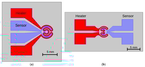 Geometry of heater-sensor structures: (a) structure with one-sided leads; (b) structure with two-sided leads.