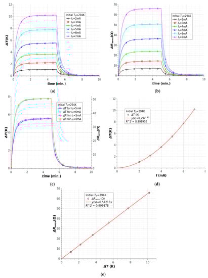 The time dependences for temperature changes ΔT and sensor resistance changes ΔR are shown in Figure 6a,b. All results confirmed that the processes for heating and cooling were typical for natural convection conditions. Increasing the current caused the temperature to rise. The changes were proportional to the current squared (Figure 6d), which is a typical relationship for the joule heating process. This was confirmed by the high temperature increase for higher currents (ΔT = 2 K for Ih = 3 mA, ΔT = 8 K for Ih = 6 mA). The elongation of temperature stabilization time for higher currents can result from changes in the resistance of the heater and especially from the character of the heat transfer processes. Changes in heater resistance were observed in the time dependence of heat power, especially for higher currents (Figure 6b). The main advantage of the microstructures is the short time constant for heating and cooling processes. It should be noted that the character of the heating and cooling processes was the same for all currents, which is important from the perspective of potential applications.