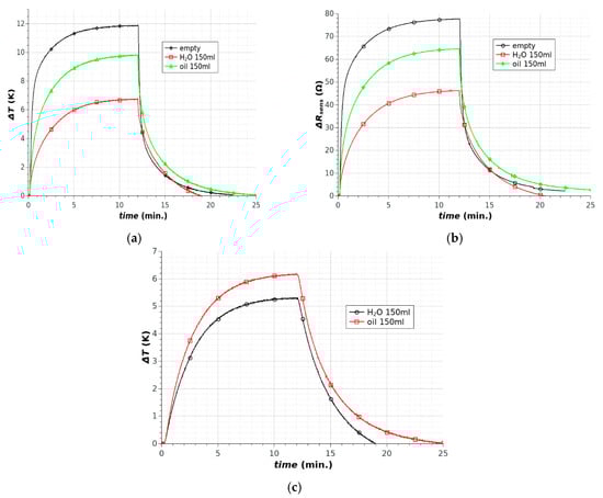 Filling the chamber with liquid allowed the changes in the dynamics of the thermal processes to be observed. The type of liquid played the key role in the kinetics of the thermal processes. The heat capacity and thermal conductivity of water are much higher than those of oil, which significantly changes the dynamics of the observed processes (Figure 8). It should be noted that, as with the results obtained for the microsystem without a chamber, the character of the changes in temperature and sensor resistance were the same. Similar changes in the temperature of the fluids were observed by direct measurement (Figure 8c). The differences in temperature were the result of the position of the sensors. The similar character of the changes is more important. Based on the results, it is possible to use the microsystems for the accurate temperature control of small volumes of various fluids near room temperature. It should be noted that the use of our microheater system did not require additional temperature monitoring because the sensor integrated with the heater structure ensured accurate measurement.