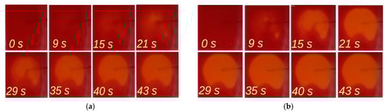 Visualization of the heating of microstructures using a thermochromic coating: (a) 100 mA; (b) 140 mA.