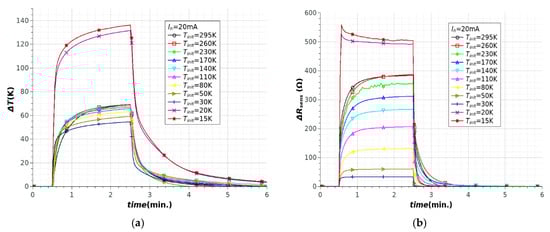 Heating of microstructures at cryogenic temperatures: (a) temperature changes; (b) sensor resistance changes.