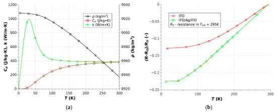 Time dependences of temperature changes ΔT and sensor resistance changes ΔR were observed at cryogenic temperatures (Figure 10). Experiments were conducted at several different initial temperatures, ranging from 15 K to 295 K. An ITO/Ag/ITO layer was used because the resistance changes of this layer were linear at a wide range of temperatures, from 300 K to 50 K (Figure 11b). The resistance changes of the ITO layer were smaller, especially below 150 K, which prevented use of a coupled temperature sensor. The additional heat load (copper heat exchanger) and lower temperature allowed the use of higher heat power in these studies (1 W for Ih = 20 mA). In addition, the contact cooling method efficiently eliminated local hotspots in the heater path, which allowed higher heat power to be used. In contrast to those obtained at room temperature, the results at cryogenic temperatures were more varied and more difficult to interpret. The wide range of temperatures changed all the properties of the heat exchanger and microsystem significantly. The most important changes were observed at temperatures below 25 K (Figure 10). For the same heat power (about 1 W), different temperature changes were measured in a range below 25 K and higher than 25 K. It should be noted that this was not a result of rapid changes in the TCO electrical properties (Figure 11a). For temperatures below 150 K to 15 K, the ITO resistance changes were very small at <3%. The resistance changes in the ITO/Ag/ITO layer were linear in the range 300–50 K and nearly constant below 50 K. For this reason, the sensor resistivity changes were not linearly dependent on the temperature changes, especially below 50 K for ITO/Ag/ITO. Noticeable changes of copper thermal properties were observed below 100 K to 30 K. In this range of temperature, the heat transfer from structure to heat exchanger increased slightly which caused decreasing structure temperature (Figure 10a, curves for Tinit = 80 K, 50 K and 30 K). The step changes in the thermal properties of the copper heat exchanger were responsible for an unconventional increase in temperature of structures below 30 K. The rapid decreases in heat capacity (cp) and heat conductivity (k) were noted in this range (Figure 11a). It should be noted that copper heat capacity was reduced to a very low value, close to zero. The strong decrease of heat capacity meant a rapid reduction of heat load. This limited the heat transfer from heater to the heat exchanger and consequently to the second stage of the cryocooler. For the same current flowing in the heater (Figure 10a) the temperature of structure reached a higher value (Figure 10a, curves for Tinit = 20 K and 15 K). The heat capacity of copper exchanger determined the thermal phenomena in temperatures below 30 K.