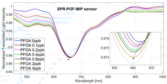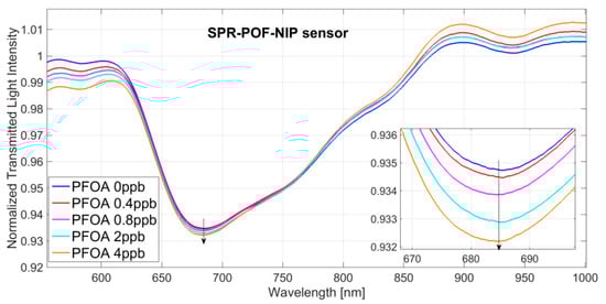 Figure 2 shows the transmission spectra of the SPR-POF-MIP normalized to the reference spectrum (spectrum achieved with air as the surrounding medium), obtained by incubating solutions at increasing concentrations of PFOA in water solution (range 0–4 ppb).