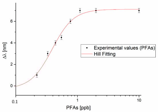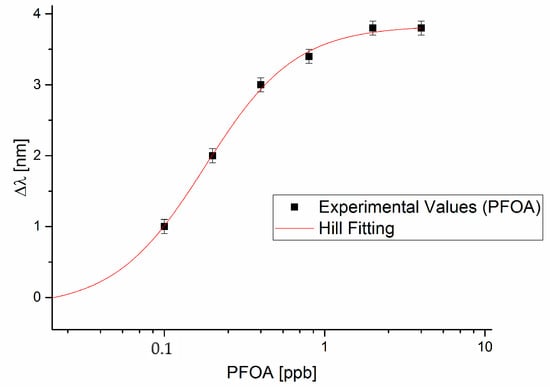 Figure 4 shows the dose-response curve, with the Hill fitting to the experimental data, acquired when the PFAs compounds are present in a mix standard (a certified reference material containing 11 different PFAs (C4–C11)). As it will be shown in Discussion section, the performances obtained in the PFOA or PFAs detection are the same. The total resonance wavelength variation (∆λmax) in Figure 4 is a bit different with respect to that reported in Figure 3, because when the dimension/weight of the analyte changes the refractive index variation in the MIP layer changes.