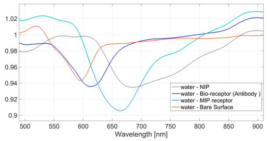 In optical sensors based on SPR in a D-shaper POF, as previously described, when the refractive index at the gold–dielectric interface increases, the resonance wavelength is shifted to the right [,,]. This can be exploited to monitor the deposition process of the receptor layer (MIP receptors or Bio-receptors), since the presence of the receptor on the gold film produces an evident change in the resonance wavelength due to the variation of the refractive index at the interface between dielectric layer and the thin gold film. Figure 6 shows the resonance wavelength, when the water is present as the bulk, in the following cases: the gold surface without a receptor layer (bare surface), the gold surface with a bio-receptor for PFOA [], the gold surface with an MIP receptor and, finally, the gold surface with an NIP receptor. The experiments were performed at room temperature and each sample was incubated 10 minutes before acquiring the signal. A shift is clearly shown in Figure 6, the refractive index of the NIP is larger than the MIP’s one, while the MIP refractive index itself is larger than the bio-receptor’s one.