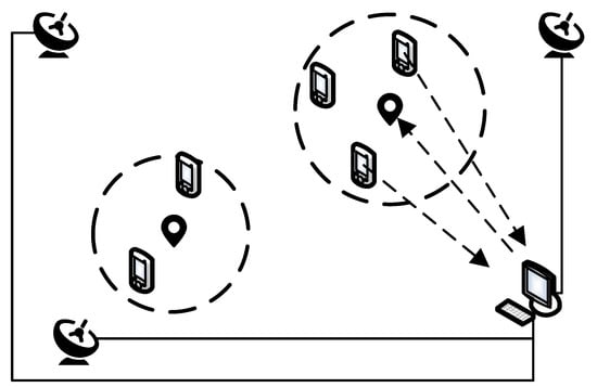 As stated, the major challenge of VRS generation is handling the propagation path-dependent biases. These biases are strongly correlated when two stations are close, and the spatial correlation weakens as the distance increases. Therefore, it is reasonable to share the same VRS information if two clients sit close to each other. In this way, we propose a spatial clustering algorithm, which clusters the clients into groups first and each group shares the same VRS information. After clustering, the unlimited client number can be mapped into limited service area. Hence, the maximum VRS number can be guaranteed with a limited network RTK service area. The concept of the spatial clustering approach can be illustrated by Figure 3. In the figure, the NTRIP caster generates five virtual stations in current network RTK systems since there are five online users. Some of the clients stand close to each other since they are working on the same project or within the same business district. Considering the spatial correlation, two independent VRS are good enough to serve all five clients. With a proper cluster radius, it is possible to achieve comparable positioning performance with only two VRSs as compared to the five-VRS solution, so the computational burden is reduced.