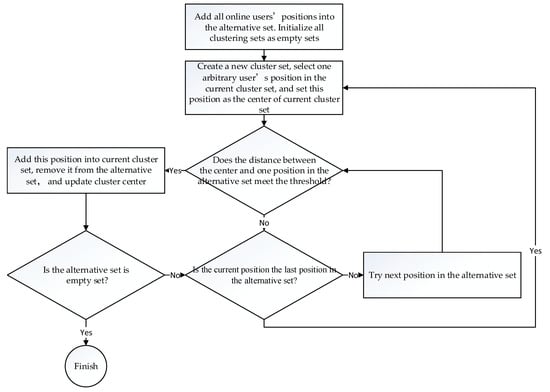 The benefits of the SOSC algorithm are three-fold. Firstly, the SOSC algorithm is an unsupervised clustering algorithm. It only requires one parameter—the radius threshold. The remaining work can be automatically finished with the algorithm. Secondly, the algorithm is computationally efficient, since the complexity of SOSC algorithm is O(n2). Thirdly, the algorithm can determine the center of clusters and the cluster number according to the spatial distribution of clients. The flowchart of the SOSC algorithm is depicted in Figure 4.