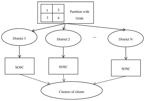 The scheme of parallel computing can be depicted by Figure 5. The figure indicates that the parallel computation scheme of SOSC algorithm is somehow similar to Google’s map-reduce scheme []. The client clustering task is partitioned into many subsets according to latitude and longitude. Then, the SOSC algorithm acts as the reducer and performs clustering on each subset in parallel. After parallel computation, the clustering results are returned back to the main task and combined for the output. The challenge of parallel computing also comes from how to reasonably partition the task to balance the computational load.
