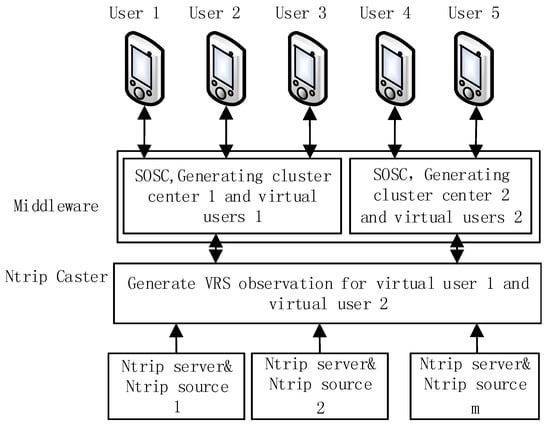The proposed algorithm can be integrated into existing network RTK platform with the middleware technique. A demonstration of network RTK system with the middleware is presented in Figure 6. The middleware is deployed between the NTRIP clients and the NTRIP caster. The middleware accepts requests from the NTRIP clients and sends VRS data back to users. The middleware is also responsible for reorganizing the online NTRIP clients by the SOSC algorithm. The online clients are mapped into the clusters and the user location is replaced with the cluster center. After merging, virtual users are generated for each cluster and the information is sent to the NTRIP caster via the middleware. In this way, the existing NTRIP caster only computes the VRS for these virtual users. After the VRS is generated from the NTRIP server, the middleware maps the VRS information for the virtual users back to the physical users. The physical users in the same cluster receive the same VRS information. By deploying the middleware, the limitation of concurrent users are converted into the limitation of virtual users. The maps between the physical user and the virtual users are controlled by the middleware and the SOSC algorithm. This provides a potential capacity for supporting more concurrent online users.