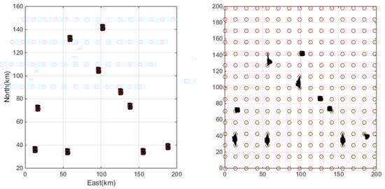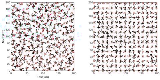 In order to evaluate the performance of the SOSC algorithm, a simulation is performed. In this study, the service area is simulated as a 200 km × 200 km square field. The cluster radius threshold for the SOSC algorithm is set as 10 km. In order to make the SOSC algorithm and the grid algorithm comparable, they should have the same cluster radius. Since no gap is allowed in the service area, the inter-station distance for the grid algorithm is 10 km rather than 20 km. As a result, 225 cluster centers are generated in total for the grid algorithm in the given service area.