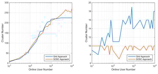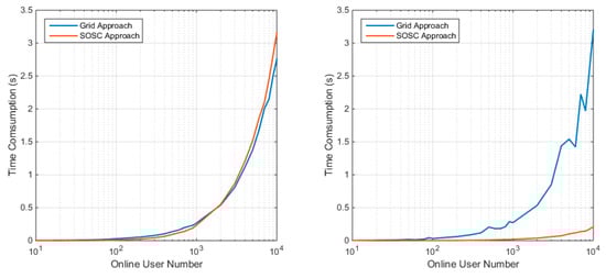 The two figures give a first impression on how do these clustering algorithms works. The following section will compare their performance more comprehensively. As stated, the computational efficiency is one of the most important performance indicators of the clustering algorithm to evaluate the computational efficiency. The time consumption depends on the client number, so we tested client numbers ranging from 10 to 10,000 to determine their computational efficiency. The time consumption of SOSC approach against different online user number is evaluated and the results are presented in Figure 9. The figure gives time consumption of the two approaches under different user distributions. The left panel shows that the time consumption of both the grid algorithm and the SOSC algorithm dramatically increase as the online user number increases. For the uniformly distribution case, the two methods have similar time consumption. The SOSC approach slightly outperforms the grid approach when the online user number is smaller than 2000 and the grid approach outperforms the SOSC approach as the user number increases. Both methods can handle about 3500 concurrent users within 1 s. Considering the clustered distribution case, the SOSC approach significantly outperforms the grid approach. The computational efficiency of the grid algorithm does not change, while the SOSC algorithm improves dramatically. The simulation results indicate that the SOSC approach can properly handle over 10,000 online users within 0.2 s, while the grid algorithm takes more than 3 s. This is because the cluster number is greatly reduced by the SOSC algorithm, so the corresponding search procedure becomes more efficient, while the grid algorithm does not change.