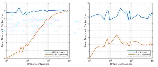 The mean distance to cluster center (MDTCC) is used to describe the optimality of the cluster center. With a given client position set, the clustering algorithm with minimum MDTCC should be the optimal clustering algorithm. However, due to the latency constraint, the SOSC is a sub-optimal clustering algorithm, which represents trade-off between the MDTCC indicator and the computational efficiency. Therefore, the SOSC algorithm cannot ensure production of the global smallest MDTCC. The MDTCCs of the SOSC approach and the grid approach are presented in Figure 11. The figure shows that the MDTCC of the grid approach is quite stable under different distributions and different client numbers, and lies between 6 km and 7 km. The MDTCC of SOSC approach is much better than the grid approach, although it is only a sub-optimal solution. The MDTCC of the SOSC approach increases as the client number increasing under the uniform distribution scenario. As the client becomes denser, the discrepancy of MDTCC between the SOSC approach and the grid approach disappears. The right panel indicates that the MDTCC of the SOSC approach is much better than the grid approach, which also indicates that the SOSC approach is more reasonable than the grid approach for the clustered distribution scenario.