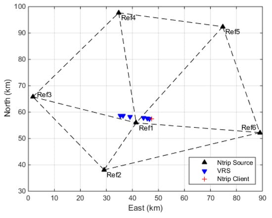 For the static test, we collect real data from a commercial CORS network to verify the impact of distance between VRS and users on the positioning performance. The CORS network is demonstrated in Figure 12. The selected CORS network involves six reference stations with inter-station distance varying from 40 km to 60 km. We obtain the VRS corrections by reporting different locations to the network RTK system. The distance between VRS and the NTRIP client varies from 0.7 km to 12.1 km. On the user side, the GNSS antenna is mounted at a fixed monument with known coordinates. Trimble NetR9 receiver is adopted for the data collection. The data was collected from 22 to 24 January 2018, with session lengths of 24 h.