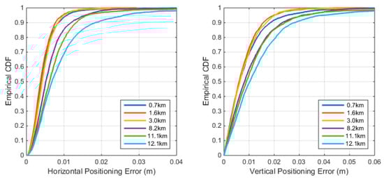 The true location of VRS can be extracted from type 1005 in the RTCM data stream and the true location of the monument is also precisely known. Then the positioning precision at the user side can be evaluated by comparing the positioning results and the truth. The cumulative distribution function (CDF) of the positioning error with different distances to the VRS is presented in Figure 13. The two panels show CDF of the horizontal and the vertical positioning error, respectively. The figure indicates that the positioning precision is negatively correlated to the baseline length between the VRS and user position. If the baseline length is smaller than 3 km, then the baseline length has almost no impact on the horizontal precision. A 10-km baseline reduces the 95% percentile of horizontal precision from 1 cm to 2–3 cm and reduces 95% vertical precision from 2 cm to 4 cm. For most applications, 2–3 cm horizontal precision and 4–5 cm vertical precision is acceptable. If the highest positioning accuracy required, a distance between the VRS and client no larger than 3 km is suggested.