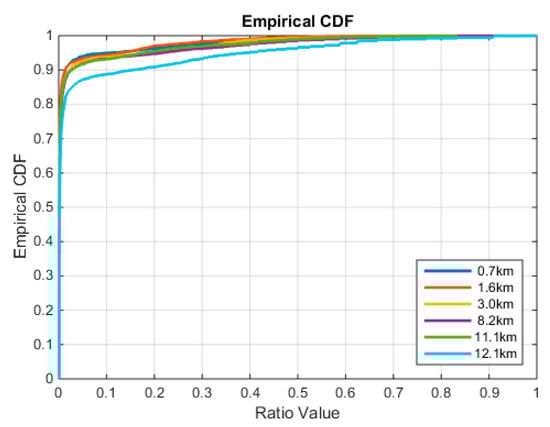 where is the float solution of ambiguity parameter, and and are the best and second best integer candidates, respectively. is the squared Mahalanobis distance. The ratio test is used to discriminate the squared Mahalanobis distance between the float solution to the best and the second best integer candidate. The larger ratio means the float solution is closer to the best integer candidate and thus more likely to be the correct integer. The ratio varies between the interval [0, 1] The CDF of the ratio distribution for different baseline length case is presented in Figure 14. The figure shows that longer baseline decreases the reliability of ambiguity fixing. In contrast to the impact on positioning accuracy, the reliability of ambiguity resolution decreases more dramatically for the 12.1-km baseline, while the other baselines achieve similar ratio value. In practice, a threshold is defined to control the reliability of ambiguity resolution. If the ratio value cannot meet the threshold, the ambiguity parameter will be left as a float value, or otherwise fixed to the best integer candidate. The popular threshold for the ratio test is 1/2 or 1/3 []. The percentage of ambiguity fixed epochs is known as the fix rate. Table 1 lists the fix rate of baselines with different baseline lengths. In this study, the threshold is given as 1/2 and the corresponding fix rate varies from 96% to 99%, which is acceptable. Since the network RTK system transmits the real-time corrections over the Internet, the fix rate also suffers from the transmission data loss, which is listed as the outage rate. Outage rate refers to the probability of not correctly receiving the VRS corrections from the network RTK system. In this case, it is also impossible to correctly fix the ambiguity at the user side. The data outage is a pure communication problem, but it affects the fix rate evaluation.