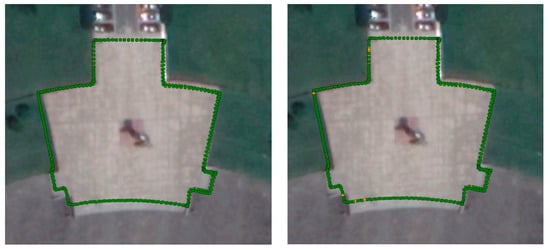 In practice, most NTRIP clients are moving rather than still, so testing the positioning performance in kinematic mode is necessary. In this experiment, the individual holds a RTK surveying device and walks around a small square for two laps. The observation is recorded by the receiver and the VRS correction is collected with different distance. The kinematic positioning is processed by post-processing with the same software and configuration for comparison purposes. For convenience, the test trajectory is aligned to a small square with an irregular shape. The positioning results are compared with the satellite images from Google Earth and the results are presented in Figure 15. The two figures give the results computed from different VRS stations. The green dots indicate the fixed-ambiguity RTK solution and the yellow dots indicate the ambiguity float solution. Given a ratio of <1/2, the fixed rates for the two tests are 98.5% and 97.5%, respectively. A detailed cross-comparison of the positioning results with two different VRSs is listed in Table 2. The table reveals that the impact of different VRSs on the positioning results in terms of the standard deviation (STD) and root mean squares (RMS). The magnitude of the impact on STD and RMS is a few millimeters. The largest difference is in the upwards direction where the RMS of the two solution differences reaches 1 cm, which is negligible for most RTK applications. The results show that the distance between the user and the VRS can be safely extended to 9.6 km without significantly degrading performance. Hence, we consider that a 10-km distance between the client and VRS is safe for network RTK users and is a practical cluster radius threshold for the SOSC algorithm.