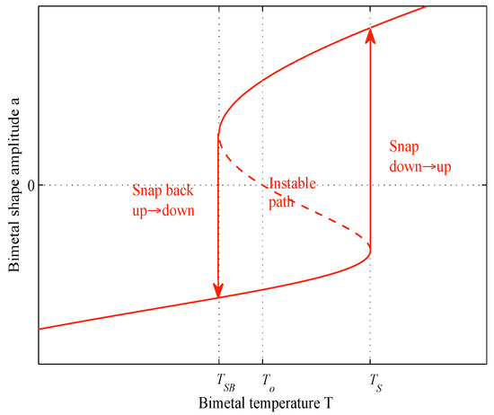 As illustrated in Figure 2, when the bimetal temperature rises and reaches the snap temperature TS, the bimetal switches from an unstable down-state to a stable up-state, releasing part of its thermal strain energy as kinetic energy. Once the bimetal has snapped, if its temperature decreases and reaches the snap-back temperature TSB (with TSB < TS), the membrane switches back to its initial state, again releasing kinetic energy.