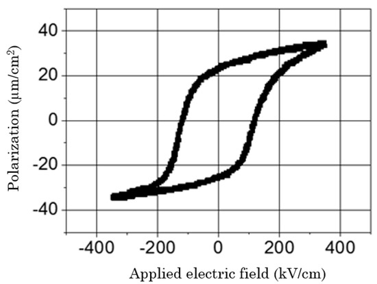 To exhibit macroscopic piezoelectric properties, the samples were poled. A Sawyer-Tower circuit was employed for the poling and to investigate the ferroelectric hysteresis cycle for each device. An electric field of 360 kV/cm at 50 Hz was applied to the samples. Figure 4 shows the hysteresis loop of a PZT thin film of 4 µm deposited onto an aluminium foil of 30 µm.