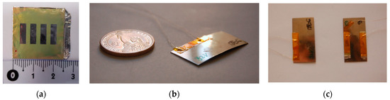 (a) Top view of the realized PZT thin films; (b) Piezoelectric bimetal with one PZT thin film; (c) Piezoelectric bimetals with one and two PZT thin films.