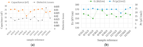 (a) Values of the capacitance and the dielectric losses of the fabricated samples; (b) Coercive field and remnant polarization of the fabricated samples.