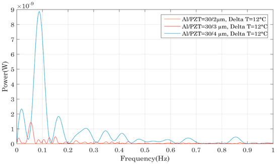 Impact of the PZT thin film thickness on the output power of the piezoelectric bimetal mounted in the device as shown in Figure 7.