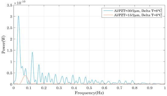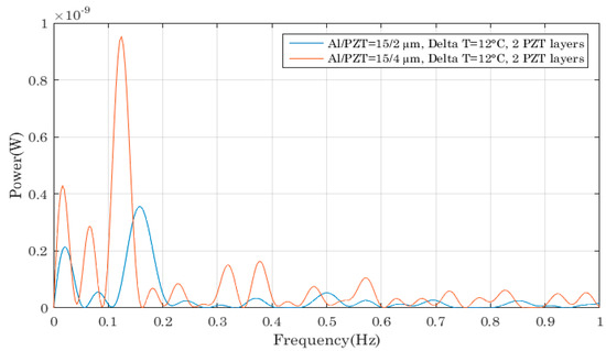 The calculation of the power output in an open circuit configuration for each device was realized using the signal’s FFT (Figure 8, Figure 9, Figure 10 and Figure 11). To access the instantaneous output power across an adapted charge, the same technique as in [19,20,21,22] is used. The FFT measurements enabled us to determine the frequential spectrum of the output voltage and power and especially at which frequency it was possible to extract the maximum power with a load resistance. Knowing this frequency, we have been able to deduct the optimal resistance maximizing the extraction of the energy of the piezoelectric capacitor. To experimentally find that optimal load resistor, different resistances are tested and the optimum power transfer is achieved for Ropt = 1/Cpiezo·ωres where Cpiezo the PZT thin film capacitance and ωres its resonance frequency. Using this adapted resistance that matches the impedance of the piezoelectric capacitor, we find that the output voltage is equally divided between the capacitor and the load resistance. In this case, the energy dissipated in the optimal load resistor is proportional to ¼ times the square of the effective voltage, so 1/8 times the square of the maximum voltage across the capacitor. Consequently, thanks to the comparison of the output power in open circuit configuration, one is able to access to the useful power across an adapted load. In each case, the compared bimetals had the same hysteresis and only the thickness of the Al or PZT films varied. In Figure 8, the bimetals had a hysteresis of 12 °C, the Al foil was 30 µm tick and the PZT thickness varied from 2 to 4 µm. Two other groups of bimetals were studied: three bimetals whose hysteresis equalled 6 °C, with an aluminium thickness of 30 µm and different PZT thicknesses of 2, 3 and 4 µm, in addition to two bimetals with a 6 °C hysteresis, aluminium foil of 15 µm and PZT thicknesses of 2 or 4 µm. For all the compared devices, we observed the same evolution: the power increased with the PZT thickness, which was logical since a thicker PZT layer led to the generation of more electrical charges and thus a higher amount of electrical power. The generated power was comprised between 0.1 nW for the sample 6/15/2 and up to 10 nW for the sample 6/30/4.