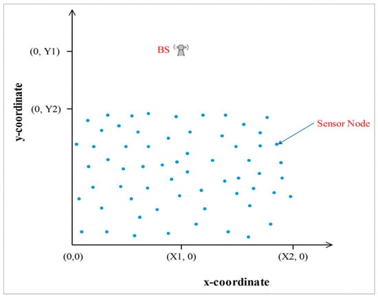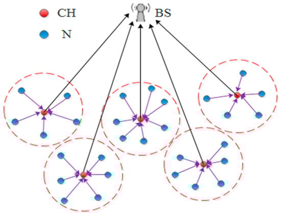 Nowadays, Wireless Sensor Networks (WSNs) are attracting the considerable attention of many researchers thanks to their participation in a variety of practical applications [1,2,3]. WSNs have a number of characteristics that make them distinctive from other conventional networks. For instance, the energy sources, the computational capabilities, and the data storages are limited [4,5]. Hence, the characteristics of WSNs must be taken into account during their use. Many routing protocols have been introduced to convey the collected data of WSN to a Base Station (BS), which in turn, forwards it to the end-user [6,7]. In this context, a group of these protocols adopted hierarchical mechanisms for delivering the sensor data to the BS. The Low Energy Adaptive Clustering Hierarchy (LEACH) protocol [8] is one of these protocols which has attained widespread acceptance in this domain. The main concept of the LEACH protocol is to split the whole area of the sensor network into clusters. Thus, every cluster combines an aggregator called a Cluster Head (CH) that is able to collect sensed data from other cluster member nodes. Figure 1 presents the topology of the sensor network within the LEACH protocol. In the LEACH protocol, the network’s lifespan is also divided into specific durations called rounds and each round includes two phases. The first phase is the set-up process, which is dedicated to picking out the network’s CHs and forming the clusters. For this reason, the whole sensor nodes choose in advance a random number between 0 and 1. Then, every node compares its random number with a threshold value T(n). Consequently, if its number is less than the T(n), this node begins working as a CH for the round in progress. It shall be noted that the T(n) value can be calculated by the Equation (1) [8]: