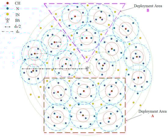 Additionally, we suppose that each cluster owns a cluster ID, which distinguishes it from other clusters. Usually, the Ns use the cluster ID to forward the sensed data to their CH. Figure 2 shows a general topology of a WSN using the proposed approach. Indeed, the proposed technique can be applied into deployment areas of sensor nodes of different shapes (parts of the general topology) and regardless of the BS position either inside or outside of the deployment area. For example, the deployment areas A and B represent two different situations that could be encountered in practice. So, even if we suppose that the sensor nodes are only deployed on the rectangular area (A) or on the triangular area (B), the same general leveling approach to distribute the nodes into levels based on their distances to the BS is used.