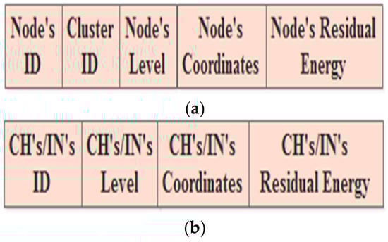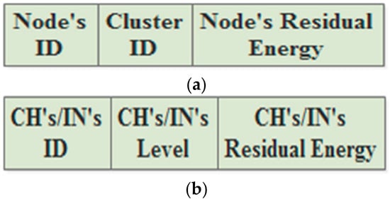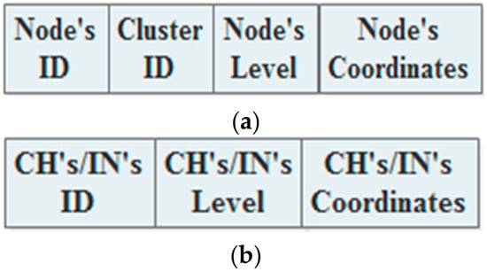 During the network lifetime, all the CHs, INs, and Ns are regularly declaring themselves to each other by broadcasting announcement messages. In the static approach, it is assumed that the different kinds of nodes use different types of broadcasting messages. Usually, they only use the messages at the beginning of every round. Hence, the Ns broadcast messages that include their IDs, cluster IDs, levels, and coordinates, is shown in Figure 3a. Furthermore, the CHs and INs broadcast announcement messages containing their IDs, levels, and coordinates, is shown in Figure 3b.