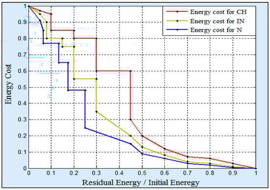 In the second part, an energy cost is given for every remaining energy ratio in NHI. Thus, every energy ratio is replaced with a cost value. Figure 7 shows an example of the energy cost values for the CHs and INs. The higher energy ratios are given lower energy costs, particularly when the energy ratio is overridden 50%. For reducing the energy load on the CHs, it is noticed that the energy ratios of the INs are granted lower cost values in comparison with the CHs. Additionally, the Ns have been given the lowest energy cost values due to their data transmissions are confined within the cluster. After computing the routes costs, the SNI arranges its RT and chooses to send its data through the lowest cost route. During the round, the route costs of the RTs will dynamically change depending on the updated messages which are received from the NHIs. It is worth mentioning that the updated messages are sent periodically. Furthermore, the SNI continue sending its data through the lowest cost route.