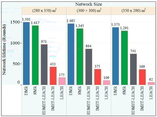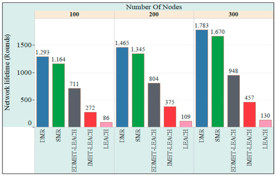 Figure 10 shows the network lifetime for the three cases considered in the second experiment. A conclusive comparison can be made, from the lifetime point of view, between DMR, SMR, LEACH, IMHT LEACH and EDMHT LEACH protocols. It can be remarked that the increase in the number of sensor nodes will rise up the lifetime of the network. At the same time, the proposed approaches have prolonged the network lifetime compared with other protocols. This result has been obtained due to the fact that the leveling approach for the whole network, which is used by the DMR and SMR techniques, has contributed in minimizing the energy dissipation in the sensor nodes. This effect becomes more pregnant if it is associated with an increase in the number of nodes that increases the total energy available in WSN. Additionally, it can be noted that the DMR technique has achieved better results than the SMR technique. It is clear that considering the energy status of the next hops, which is proposed by DMR, before transmitting the data has enabled the DMR technique to avoid the rapid decline in the energy of the network’s nodes and maintained the overall balance in the sensor network more than SMR. Hence, the DMR significantly extends the lifetime of the network, particularly if the number of sensor nodes in the network is large.